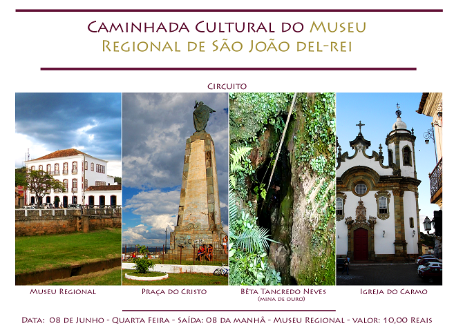 O Museu Regional de São João del-Rei (MRSJDR) realiza na próxima quarta-feira, 8 de junho, a Caminhada Cultural por São João del-Rei. O Circuito vai percorrer quatro pontos turísticos da cidade: Museu Regional; Praça do Cristo, no bairro de Senhor dos Montes; Bêta Tancredo Neves e a Igreja do Carmo. A saída será às 8hs, do Museu Regional, com um valor de RS10.