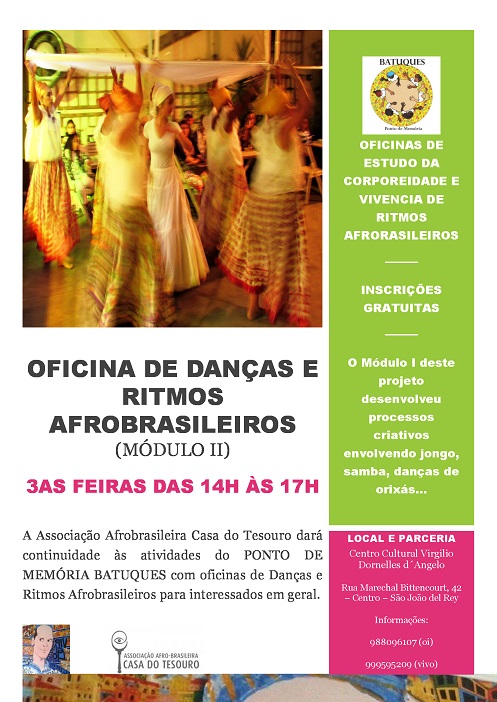 A Associação Afrobrasileira Casa do Tesouro em parceria com o Centro Cultural Virgilio Dornelles d´Angelo e a Associação de Congado Santa Efigenia convidam para participação nas oficinas de Danças e Ritmos Afrobrasileiros que acontecem todas as 3as feiras das 14h às 17h no Centro Cultural Virgilio Dornelles d´Angelo localizado na Rua Marechal Bittencourt, nº 42 no Centro de São João del Rey. A inscrição é gratuita e as aulas são ministradas pela professora Celina Batalha