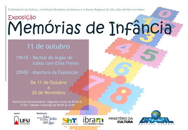 Exposição traz peças que relembram a melhor parte da vidaNo dia 11 de outubro, às 20hs, o Museu Regional convida todas as pessoas que já brincaram ou brincam para comparecer a abertura da exposição “Memórias da Infância”. Serão expostos brinquedos feitos de materiais baratos, como barro e papel, alguns produzidos por alunos das escolas municipais de Sâo João del-Rei, uma coleção de pipas da Brinquedoteca da UFSJ e fotografias de professoras de escolas da cidade. Além da inauguração, teremos também o recital de órgão de tubos, com Elisa Freixo, às 19h15. A entrada é gratuita.
