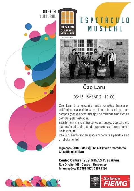 Nesta semana, mais precisamente no sábado, dia 03 de dezembro, às 19h, destacamos um espetáculo musical imperdível: Cao Laru.