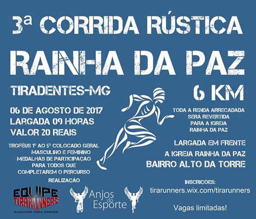 A 3ª CORRIDA RAINHA DA PAZ, tem a organização/realização da Associação dos Atletas de Tiradentes – ASSAT Equipe Tirarunners e do Anjos do Esporte – Grupo Social de Solidariedade, e será realizada no dia 06 de Agosto de 2017 (domingo), com largada na Igreja Rainha da Paz, localizada na Rua Ibipuruna, no bairro Alto da