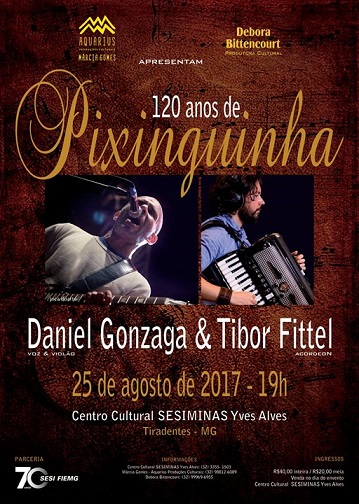 Com muito orgulho e alegria convidamos a todos para o Show ‘120 Anos de Pixinguinha’. Nele pretendemos a lembrança da trajetória desse músico, compositor e intérprete passeando em suas composições num encontro de dois artistas de excelência musical: Daniel Gonzaga, com sua voz forte e ao mesmo tempo doce, acompanhado com maestria por Tibor Fittel, no acordeon.