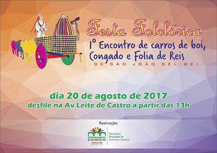 A Secretaria Municipal de Cultura e Turismo em parceria com a Associação dos Agentes Culturais das Vertentes, tem a satisfação de convidar seu grupo de folia de Reis/congado a participar conosco da Festa Folclórica com o 1º ENCONTRO DE CARROS DE BOIS, CONGADOS E FOLIAS, a se realizar domingo, dia 20 de agosto, na Avenida Leite de Castro, Bairro das Fábricas, em São João del-Rei, com a seguinte programação: