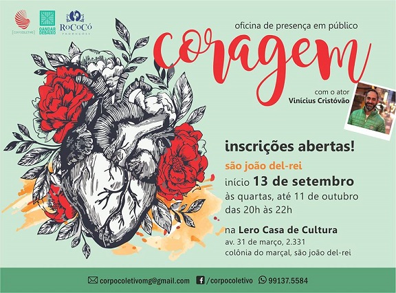 Inscrições abertas para Oficina Coragem - Presença em Público, ministrada pelo ator e produtor cultural Vinícius Cristovão, uma oportunidade para quem deseja ou necessita se conhecer melhor e trabalhar as habilidades do falar e se expressar com segurança e coragem. na vida e no trabalho.