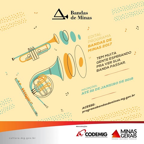 As inscrições para o edital do Programa Bandas de Minas foram prorrogadas. Agora você pode inscrever seu projeto até 22 de janeiro de 2018. O certame disponibiliza R$ 1 milhão para a compra de aproximadamente 680 instrumentos para Bandas Civis de Música de Minas Gerais como forma de contribuir para a manutenção e o aperfeiçoamento desta tradicional manifestação artística. Participe!