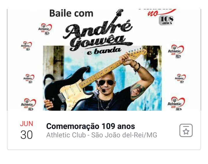 Um clube, sua história e tradição. Não é de hoje que o Athletic integra, com destaque, a vida social e esportiva da cidade de SJDR. Em comemoração ao aniversário do clube, vigoroso e atuante ems eus 109 anos, o Athletic traz André Gouvêa e Banda, o músico que fez história em noites inesquecíveis no Salão Nobre e grandes réveillons na boite do clube, protagonizando os melhores bailes no início dos anos 2000. Lapidado pela carreira de sucesso, André Gouvêa está ainda melhor. Reúna os amigos e venha "dançar a vida"! Dia 30 de junho a partoir das 22 horas. Ingressos à venda na secretaria do clube.