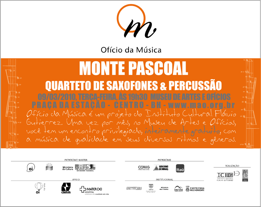 Você está convidado a participar, ver, ouvir, sentir e curtir a música instrumental de qualidade interpretada e reinventada pelo quarteto Monte Pascoal em show gratuito que abre a temporada de 2010 do projeto Ofício da Música, nesta terça-feira, dia 09 de março, às 19h30, no Museu de Artes e Ofícios, na Praça da Estação.