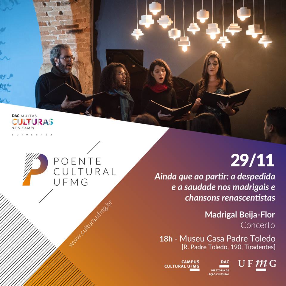 O projeto Poente Cultural UFMG, do Campus Cultural UFMG em Tiradentes, recebe na próxima quinta-feira (29) o grupo vocal Madrigal Beija-Flor com o recital “Ainda que ao partir: a despedida e a saudade nos madrigais e chansons renascentistas”.