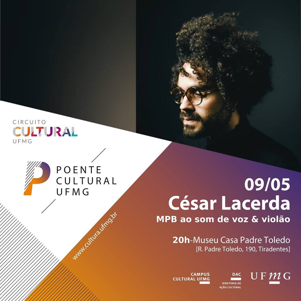 O projeto Poente Cultural UFMG, do Campus Cultural UFMG em Tiradentes, recebe no dia 9 de maio (quinta), às 20h, no Museu Casa Padre Toledo, o cantor, músico e compositor César Lacerda com o show “Tudo, tudo, tudo, tudo”, uma mostra especial ao som de voz e violão desse novo expoente da MPB.