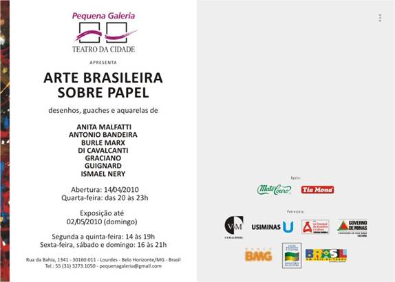 Convido para a abertura do calendário de exposições da Pequena Galeria do Teatro da Cidade, apresentando uma coleção de obras sobre papel de alguns dos maiores artistas brasileiros: Guignard, Di Cavalcanti, Antonio Bandeira, Clóvis Graciano, Milton da Costa, Burle Marx, Anita Malfatti e Ismael Nery.