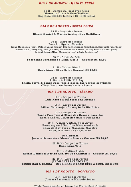 12ª Festival Duo Jazz . Edição Tiradentes . Programação Completa . De 01 a 04 de Agosto . 2019