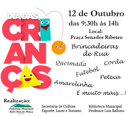 Vem aí o Dia das Crianças, e nada melhor que aproveitar essa data para relembrar das antigas brincadeiras de ruas: Queimada, Corda, Futebol de meia, Peteca, Amarelinha, Bolinhas de Sabão e muito mais!! No sábado, dia 12 de outubro, a partir das 9:30h na Praça Senador Ribeiro - Em frente a Igreja da Matriz.
