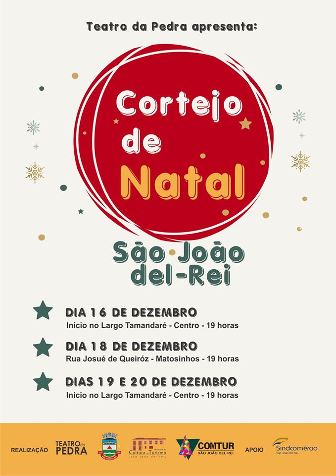 O Teatro da Pedra encerra suas atividades de 2019 levando para as ruas de São João del-Rei o “Cortejo de Natal”, entre os dias 16, 18, 19 e 20 de dezembro. Atentem-se aos locais e venham conosco.