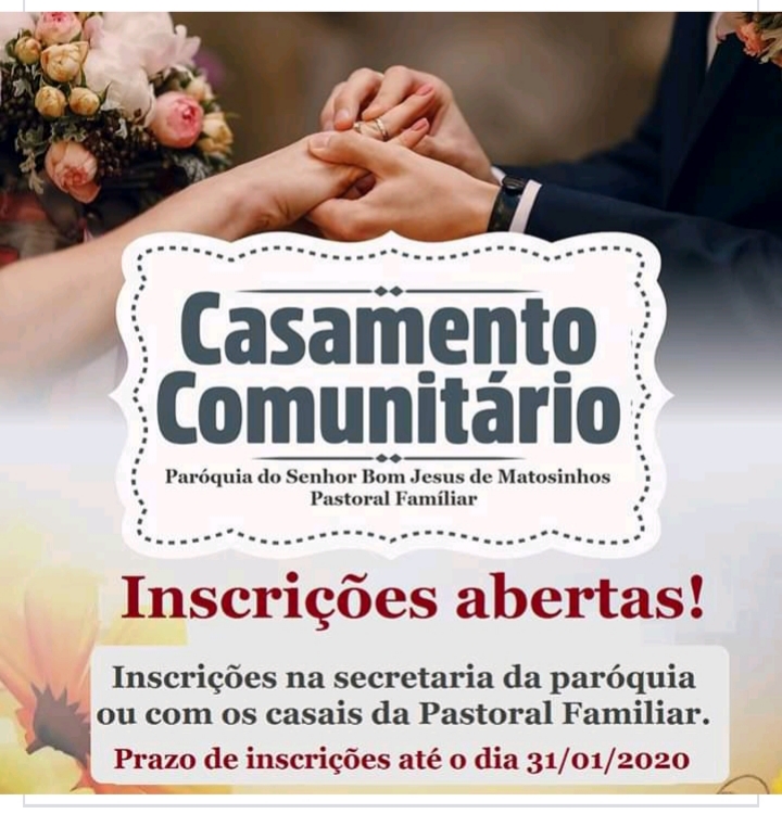 Inscrições para "Casamento Comunitário" . Pastoral da Família . Paróquia Sr. Bom Jesus de Matosinhos . Até 31 de janeiro . 2020