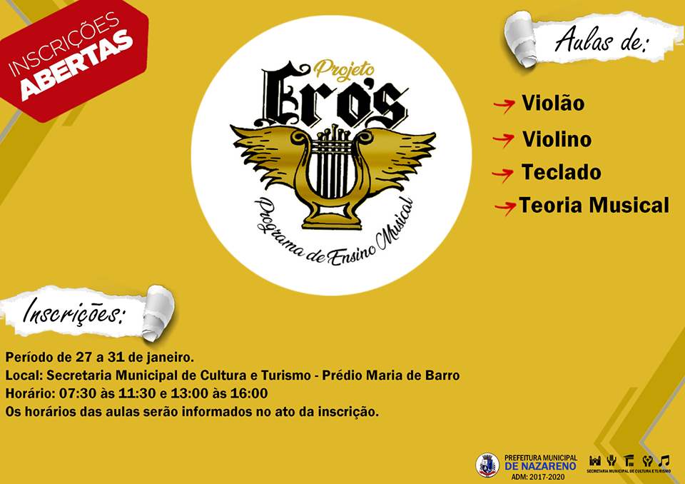 Inscrições abertas para "Projeto Ero's - programa de ensino musical" . Aulas de teoria musical e instrumentos . Secretaria Municipal de Turismo . 2020