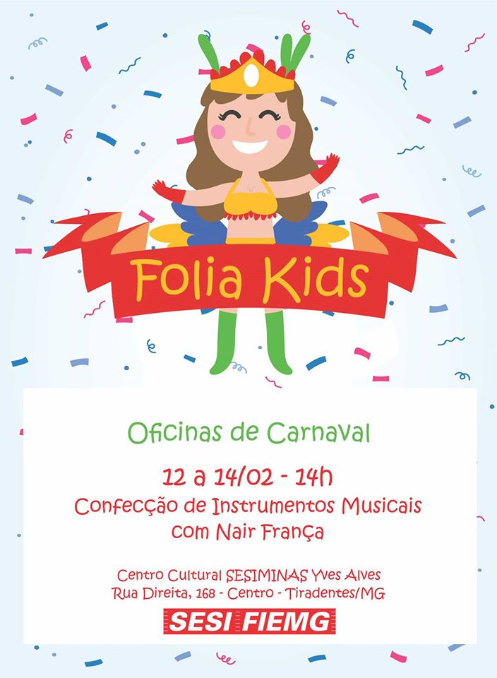 Oficinas de Carnaval "Folia Kids" . Confecção de instrumentos musicais com Nair França . Centro Cultural Sesiminas Yves Alves . De 12 a 14 de fevereiro . 2020