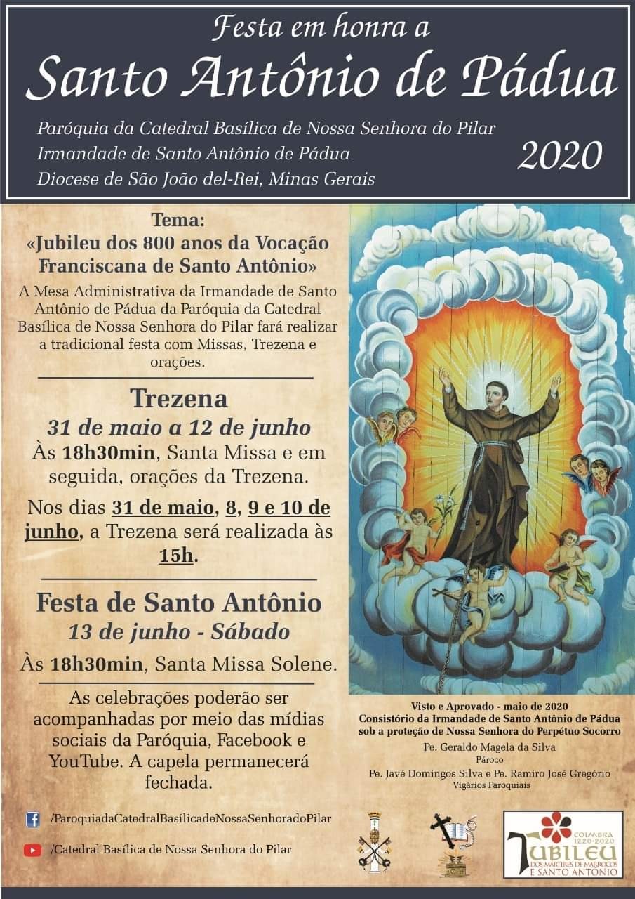 Festa em honra à Santo Antônio de Pádua . Paróquia da Catedral Basílica de Nsra do Pilar . Transmissão pelo facebook da Paróquia . 2020.