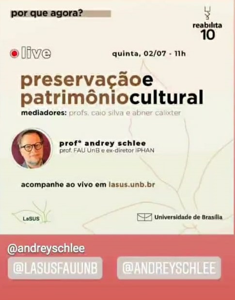 Live "Preservação e Patrimônio Cultural" com Professor Andrey Schlee - FAU- Universidade de Brasília . Ao vivo em lasus.unb.br . 2020