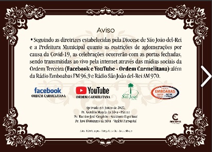 Festividades em honra à Nossa Senhora do Carmo . Programação completa de 07 a 15 de julho . Facebook e canal no Youtube Ordem Carmelita . 2020
