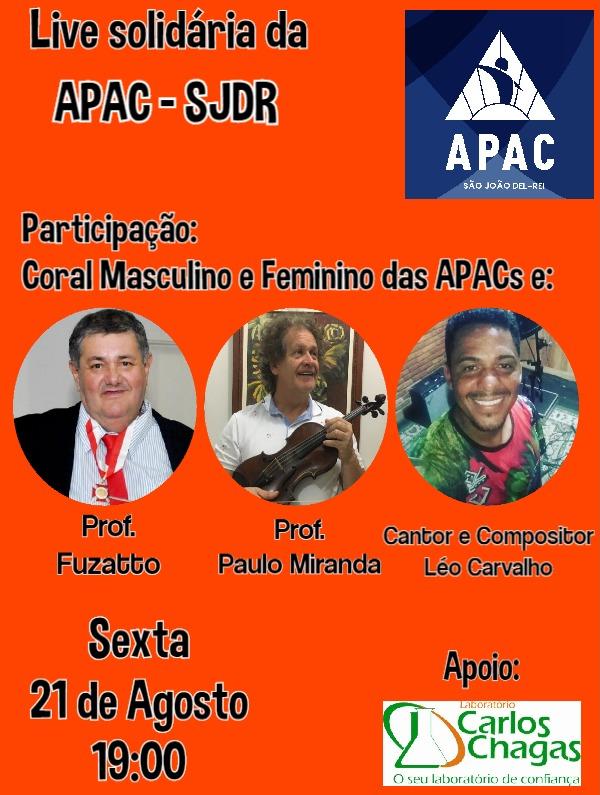 Vamos oferecer música e descontração - ao vivo - na página da APAC de São João del-Rei no facebook. Algumas músicas foram gravadas com os recuperandos e serão exibidas online. Com apresentação do presidente da APAC, Antônio Carlos de Jesus Fuzatto, professor Paulo Miranda no violino e Léo Carvalho na voz e violão. Participação especial dos corais da und. feminina e masculina, e APAC's de Minas Gerais.