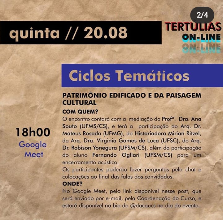 Do perfil do DacauCS: "O encontro do Tertúlias On-line dessa semana, dia 20 de agosto, terá como tema “PATRIMÔNIO EDIFICADO E DA PAISAGEM CULTURAL”, tão necessária, ainda mais nessa semana em que se celebra o Dia do Patrimônio Histórico Nacional (17/08).