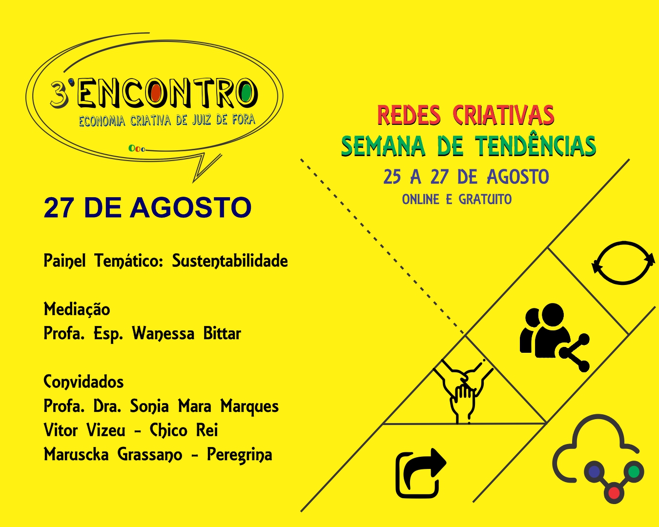 EVENTO DE ECONOMIA CRIATIVA E SUSTENTABILIDADE o 3° Encontro de Economia Criativa em Juiz de Fora, que acontece no período de 22 a 27 de agosto, visa ser um momento de reflexão sobre: a integração e articulação de oportunidades em redes criativas. Tendo a finalidade de apresentar como temática central o empreendedorismo, a cultura de rede e a sustentabilidade e ainda cases da cidade de Juiz de Fora que fazem uso da rede criativa para ampliar conhecimentos e oportunidades no setor de atuação. .