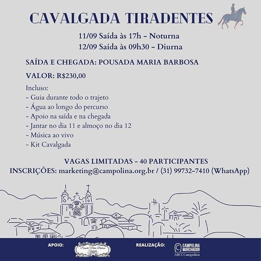 Cavalgada Tiradentes . Pousada Maria Barbosa . Dias 11 e 12 de setembro . Vagas limitadas . 2020