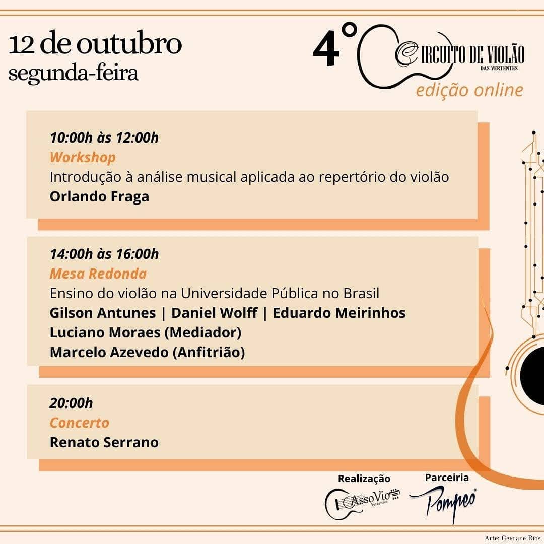 4º Circuito de Violão das Vertentes . Assovio Vertentes . Edição online . Programação completa de 12 a 16 de outubro . Ao vivo pelo Youtube . 2020