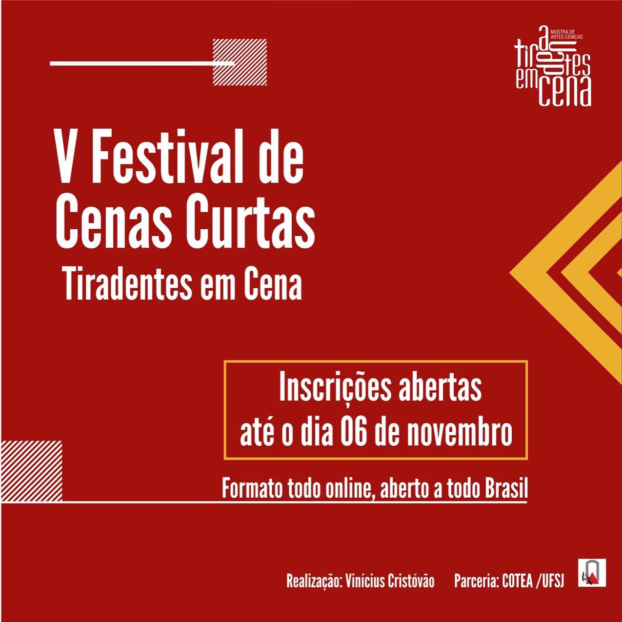 A Mostra Tiradentes em Cena e o ator e produtor Vinícius Cristóvão apresentam a V Edição do Festival de Cenas Curtas e lançam, através do presente Edital, chamada para seleção de cenas/performances de no máximo cinco minutos.