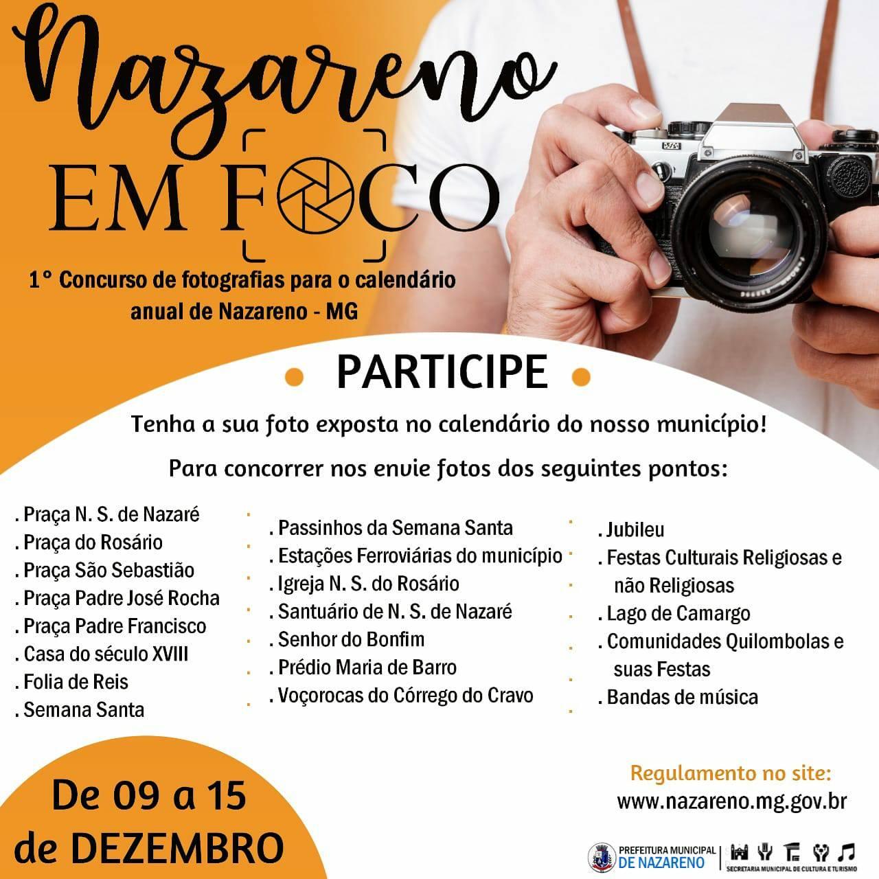1º Concurso Fotográfico “Nazareno em Foco" . Calendário anual . Prefeitura Municipal de Nazareno . Inscrições de 09 a 15 de dezembro . 2020