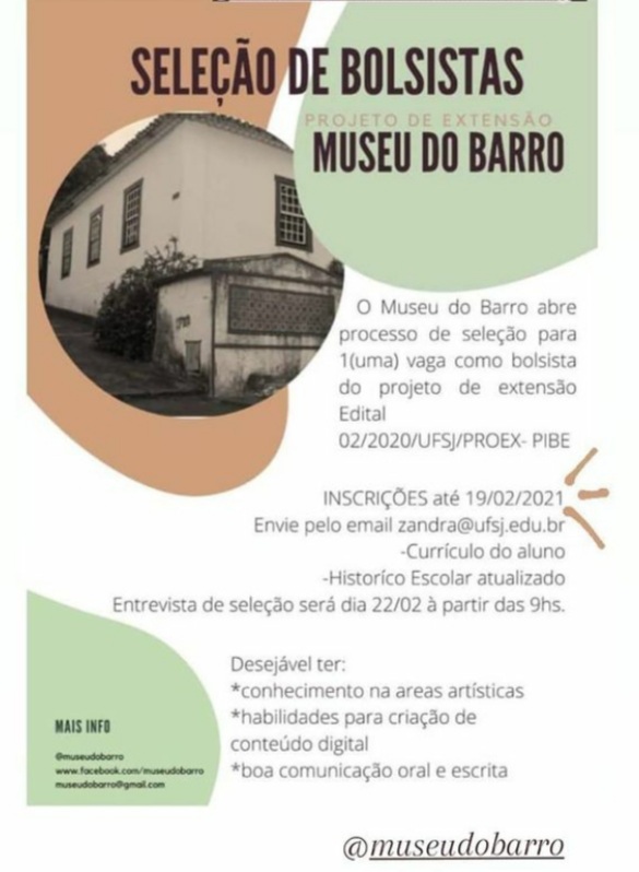 Seleção de bolsistas . Projeto de extensão "Museu do Barro" . UFSJ . Inscrições até 19 de fevereiro . 2021.
