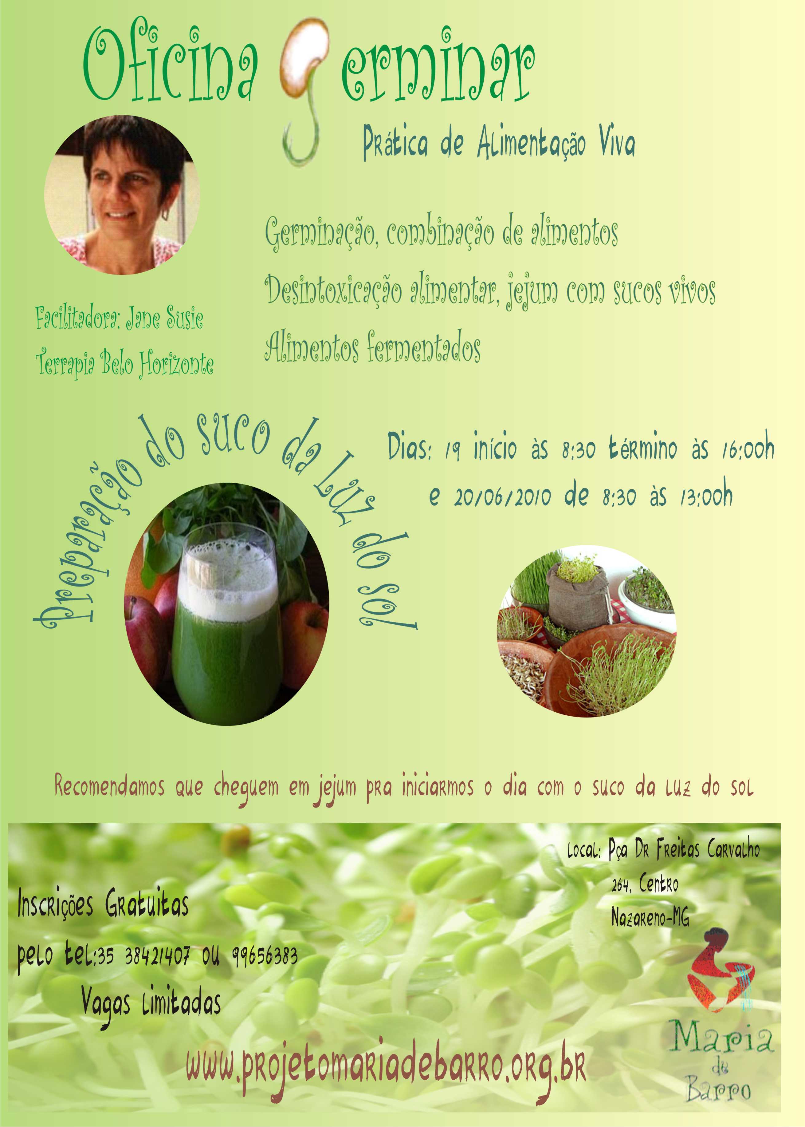O Projeto Maria de Barro receberá nos dias 19 e 20 de junho, Jane Susie representante do terrapia em Minas Gerais. O Terrapia é um projeto ligado ao Centro de Saúde Escola Germano Sinval Faria (CSEGSF) da Escola Nacional de Saúde Pública (ENSP), no Rio de Janeiro e promove a disseminação da alimentação Viva.