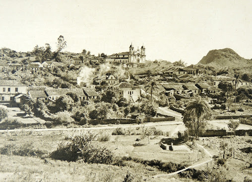 Núcleo antigo de Tiradentes, no primeiro plano uma pinguela sobre o Ribeiro Santo Antônio. Fotografia da década de 1940, em Relíquias da Terra do Ouro, de Edgard de Cerqueira Falcão.