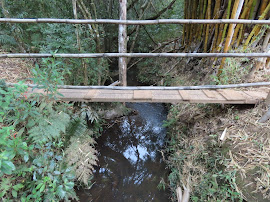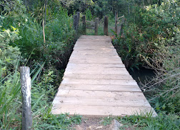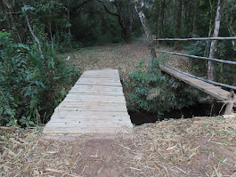 Ponte da Trilha do Gualter, em madeira, sobre o Ribeiro Santo Antônio e pinguela. Fotografias: Luiz Cruz.
