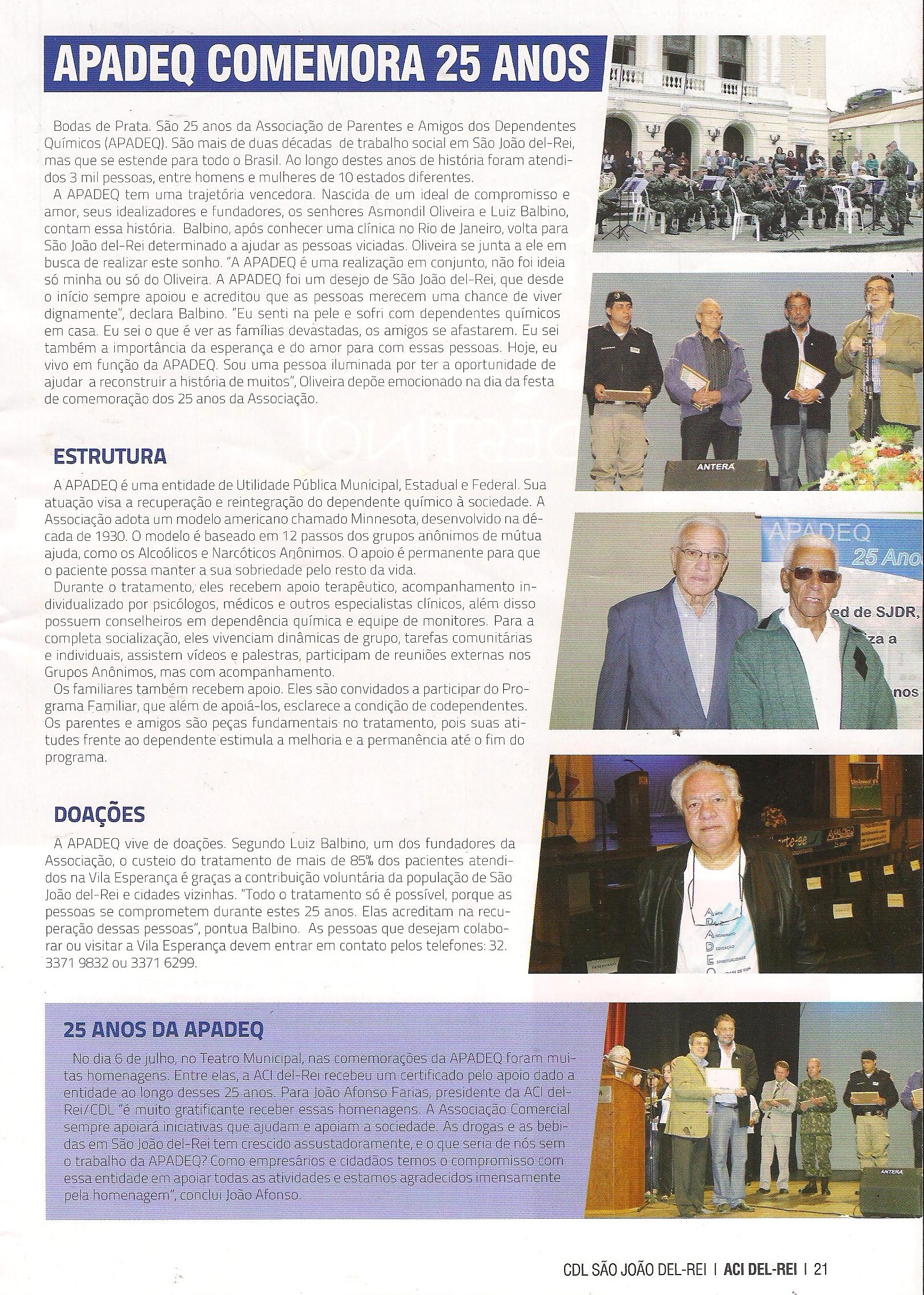 APADEQ - Associação de Parentes e Amigos dos Dependentes Químicos é uma sociedade civil, sem fins lucrativos, sem conotação política ou religiosa, de caráter assistencial, educativo e científico, totalmente legalizada. Foi fundada por pessoas que tiveram a feliz oportunidade de se recuperar da dependência química ou de assistir e participar de um processo de recuperação de um parente ou amigo. A APADEQ foi fundada em fevereiro de 1988, em São João Del Rei, e a partir de uma concepção racional e humana da doença da dependência química. Seus principais objetivos são a prevenção e a paralisação dessa doença, propiciando tratamento e apoio para a recuperação dos doentes e sua reintegração na sociedade. Para isso a APADEQ conseguiu, após 10 anos de lutas, concluir seu maior sonho, a Vila Esperança. Vila Esperança é um Centro para Tratamento de Dependência Química, projetado e construído especificamente para este tipo de atendimento. Possui toda a infra-estrutura para este gênero de trabalho, em um ambiente favorável ao tratamento residencial de dependentes químicos, de ambos os sexos. São 1270 metros quadrados de área construída, em terreno próprio de 5138 m2 , onde se encontram instalados dentre outros: