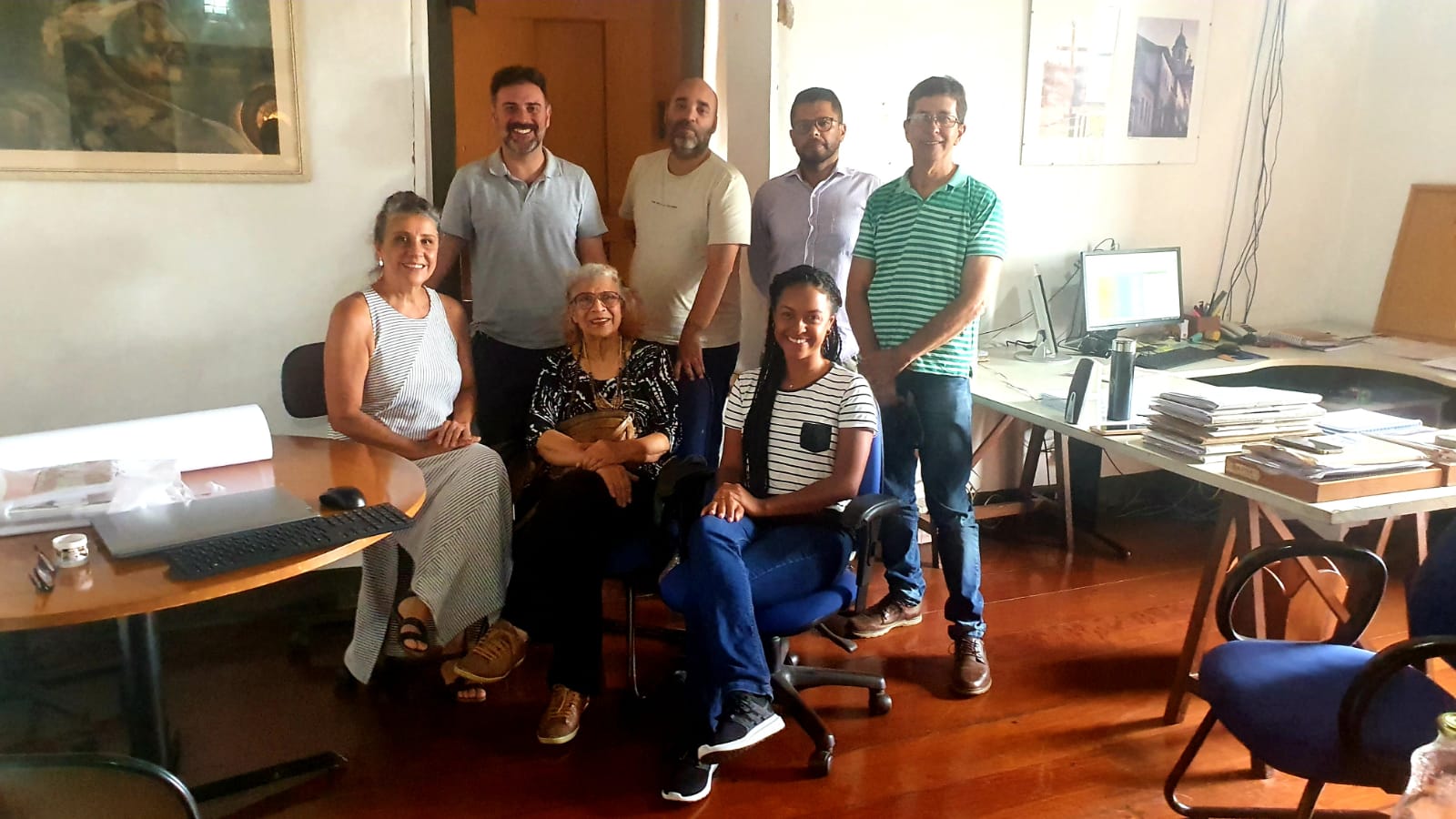 Foto: Alzira Agostini Haddad, Maria José Boaventura, Bruna dos Santos, Júnior Guimarães, João Paulo Martins, Sérvulo Matias e Luiz Cruz | IPHAN Tiradentes/Reunião em abril de 2024 do Projeto Ser nobre é ter identidade e Banco de Dados São João del-Rei, Tiradentes e Ouro Preto Transparentes/Inventário sociocultural