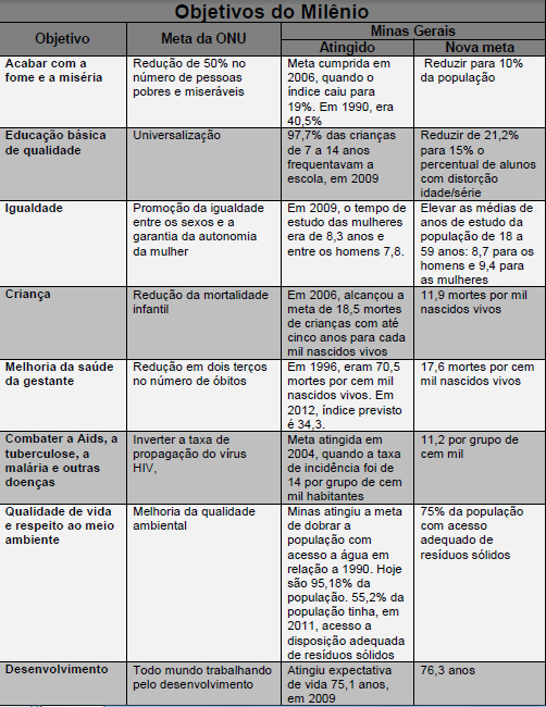 Minas já conseguiu cumprir sete das oito metas pactuadas. Agora, segundo a ONU, se torna a primeira região subnacional do mundo a propor e assinar novas e mais desafiadoras metas para serem cumpridas até 2015. A intenção do Governo do Estado com essa ação é estabelecer compromisso com patamares de desenvolvimento humano e social ainda mais arrojados. Os secretários de Estado também assinaram a repactuação.