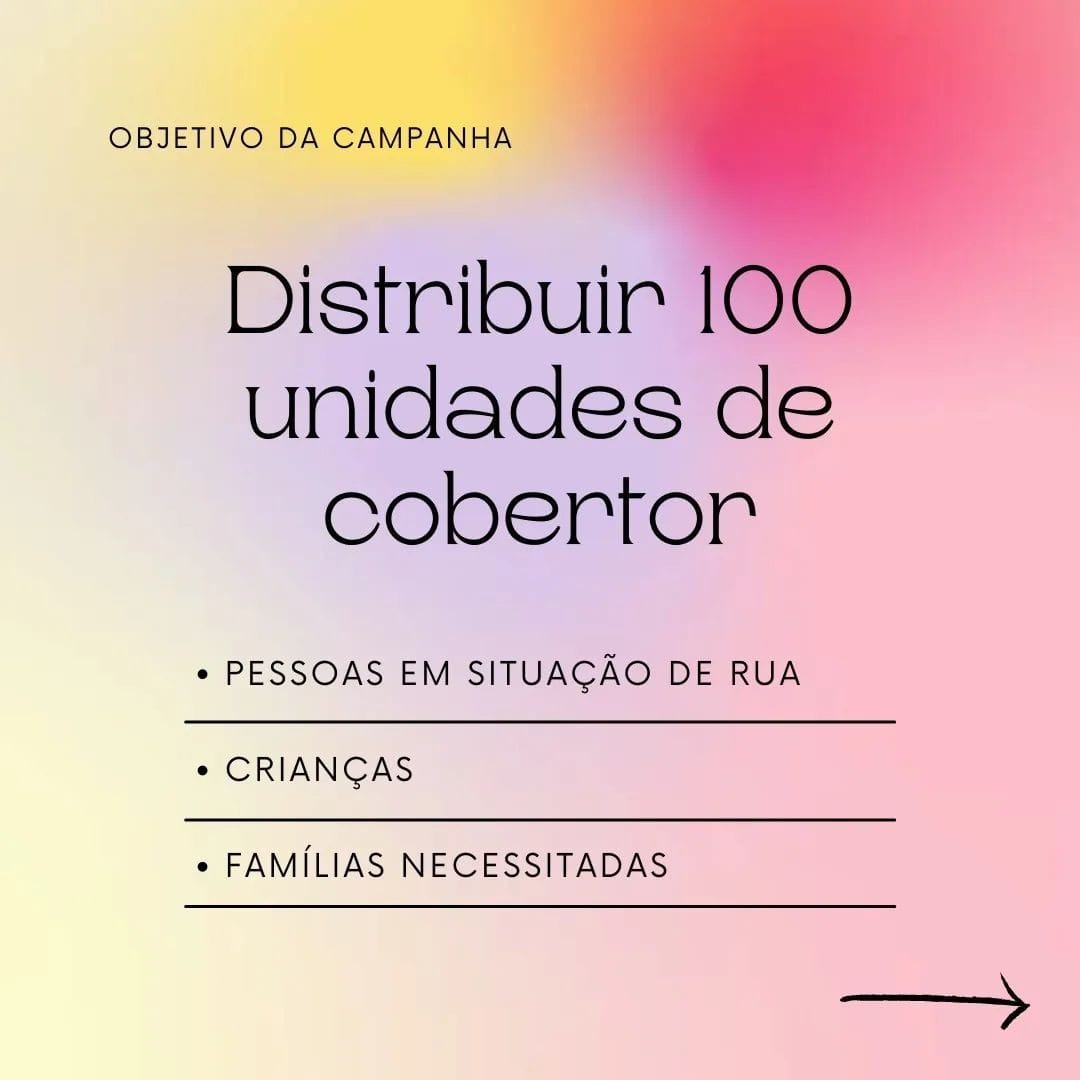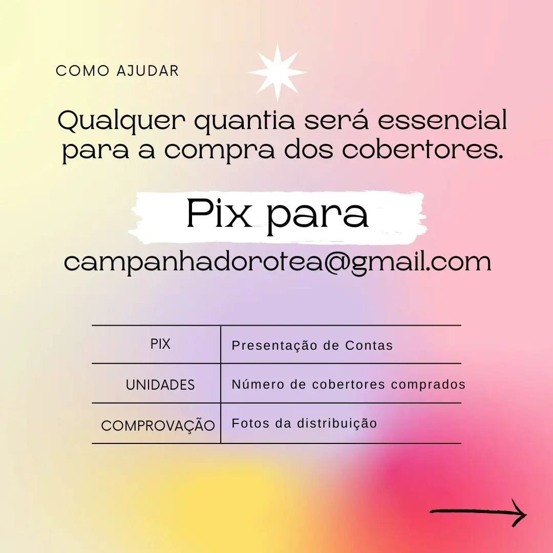 Ajude na Campanha contra o frio. Qualquer quantia é bem-vinda iremos comprar 100 cobertores (ainda procurando o melhor modelo) e entregaremos para moradores em situação de rua. O pix de arrecadação é o e-mail campanhadorotea@gmail.com em nome de Bruno Grossi Silva Gomes.