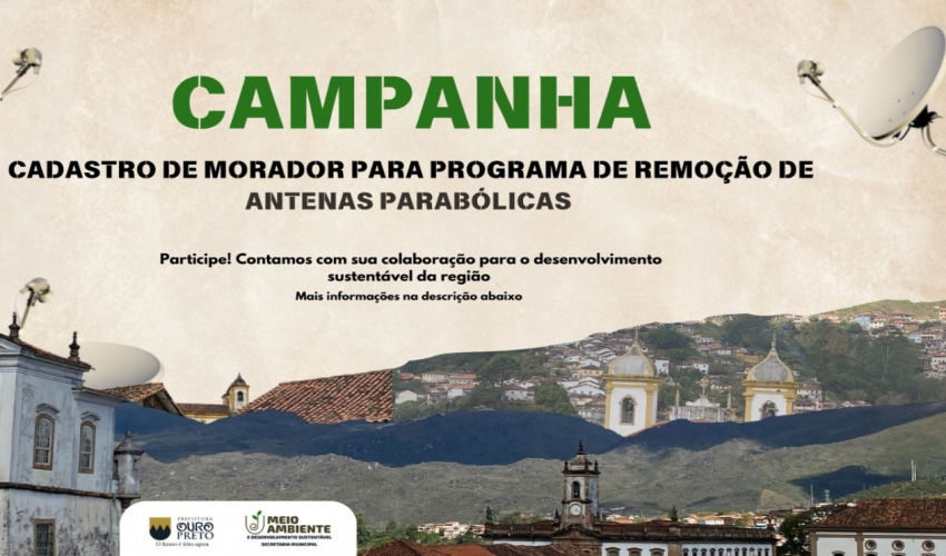 No dia 15 de outubro, a Prefeitura de Ouro Preto, por meio da Secretaria de Meio Ambiente e Desenvolvimento Sustentável, lançou a campanha “Cadastro de Morador para o Programa de Remoção de Antenas Parabólicas”. O objetivo é retirar as antigas antenas parabólicas e de TV a cabo das residências, uma vez que o sinal analógico tem previsão de ser desligado ainda em 2024, com a possibilidade de prorrogação até 31 de dezembro de 2025.