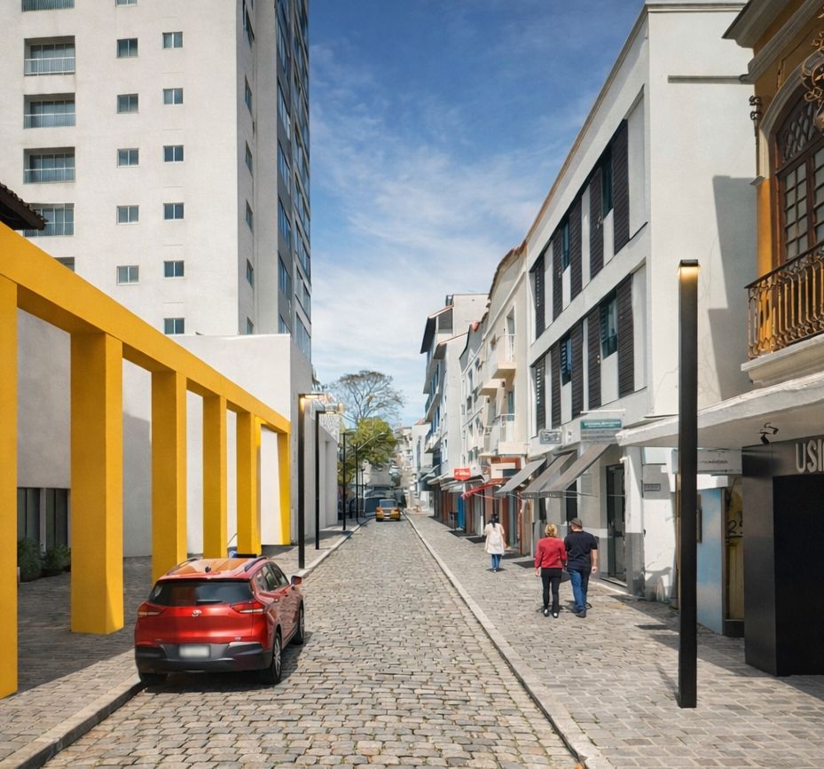 Uma ideia rápida para o velho Kibom. O pórtico ajuda a manter o alinhamento da via e serve para que as grades de proteção do Shopping sejam móveis e se escondam por trás dele facilitando o processo de segurança e tirando uma tralha de grades que ficam por lá. Nesse trecho da Ministro Gabriel Passos o asfalto deve ser retirado até a Prefeitura. E uma rua antiga e que passa todas as grandes procissões da cidade.