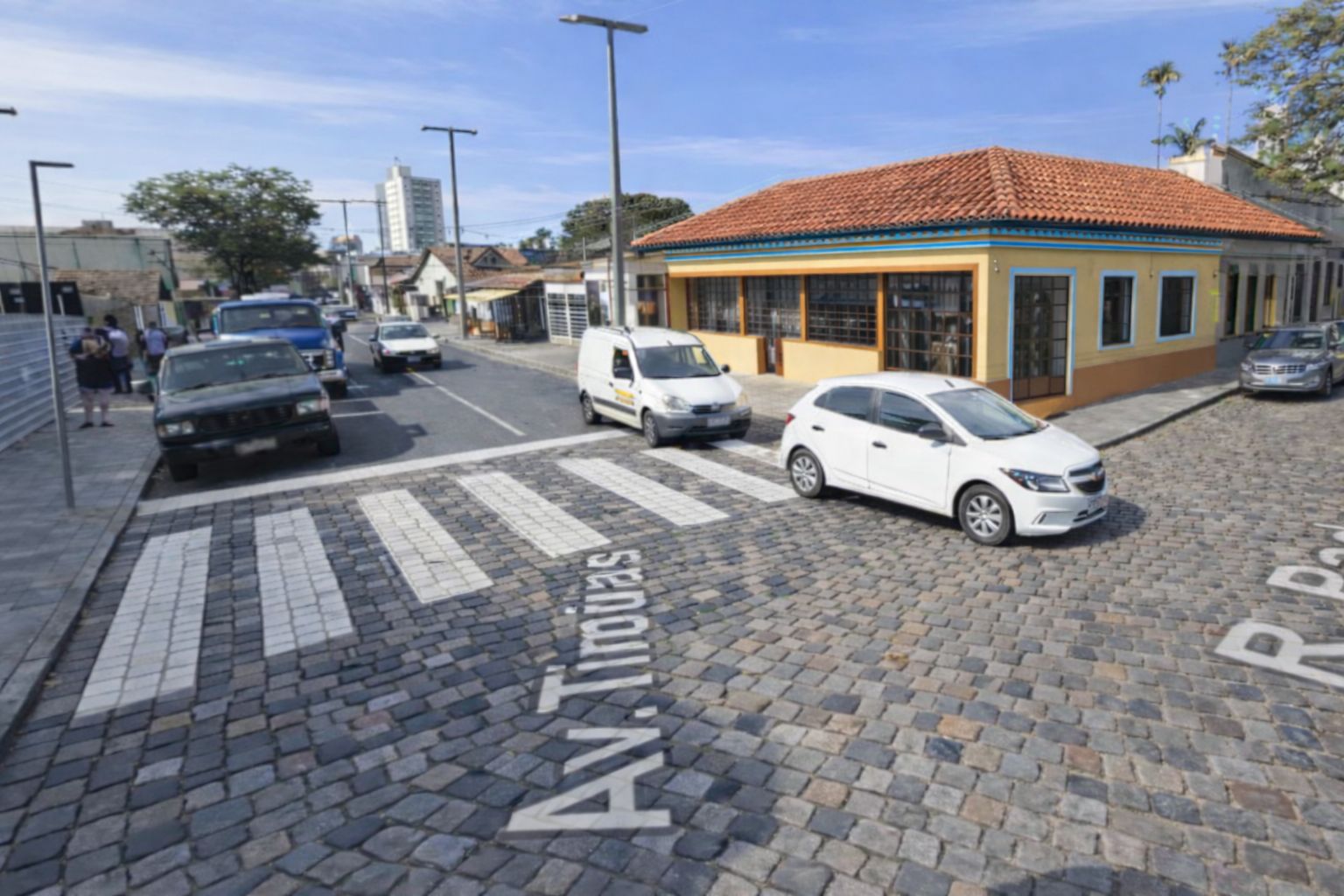No final da Avenida Tiradentes com rua da Prata, a transição entre asfalto e paralelepípedo e feita de maneira correta, com uma faixa de pedestres também desenhada em pedra e definindo o limite de separação das duas paginações que definem o desenho urbano da via.