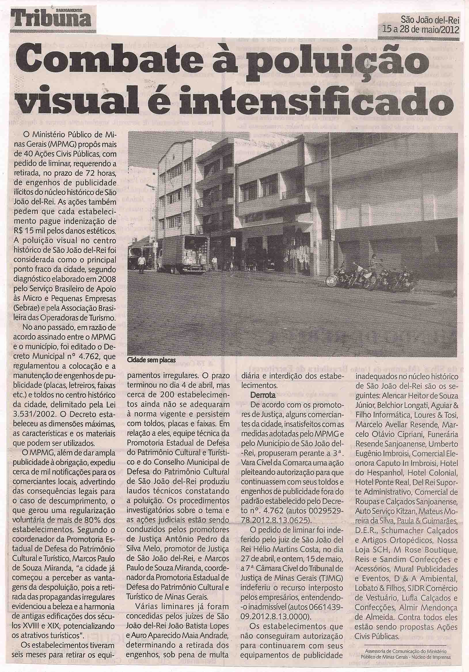 O Ministério Público de Minas Gerais (MPMG) propôs mais de 40 Ações Civis Públicas, com pedido de liminar, requerendo a retirada, no prazo de 72 horas, de engenhos de publicidade ilícitos do núcleo histórico de São João del-Rei. As ações também pedem que cada estabelecimento pague indenização de R$ 15 mil pelos danos estéticos. A poluição visual no centro histórico de São João del-Rei foi considerada como o principal ponto fraco da cidade, segundo diagnóstico elaborado em 2008 pelo Serviço Brasileiro de Apoio às Micro e Pequenas Empresas (Sebrae) e pela Associação Brasileira das Operadoras de Turismo.