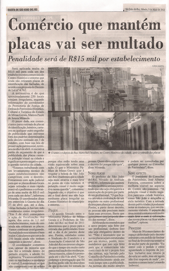 Os comerciantes do Centro Histórico são-joanense travarão corrida contra o tempo para se adequarem a acordo firmado entre o Ministério Público de Minas Gerais (MP-MG) e a Prefeitura de São João del-Rei. Dentro de exatos 30 dias, os estabelecimentos comerciais da área deverão retirar placas de identificação, cartazes, letreiros ou qualquer outro engenho de publicidade que fuja aos padrões estabelecidos pelo Decreto nº 4.762, assinado em 3 de outubro, com base em outras leis de preservação patrimonial. Isso significa que a partir de 4 de janeiro as fachadas comerciais deverão estar limpas para a instalação de novos materiais padronizados.