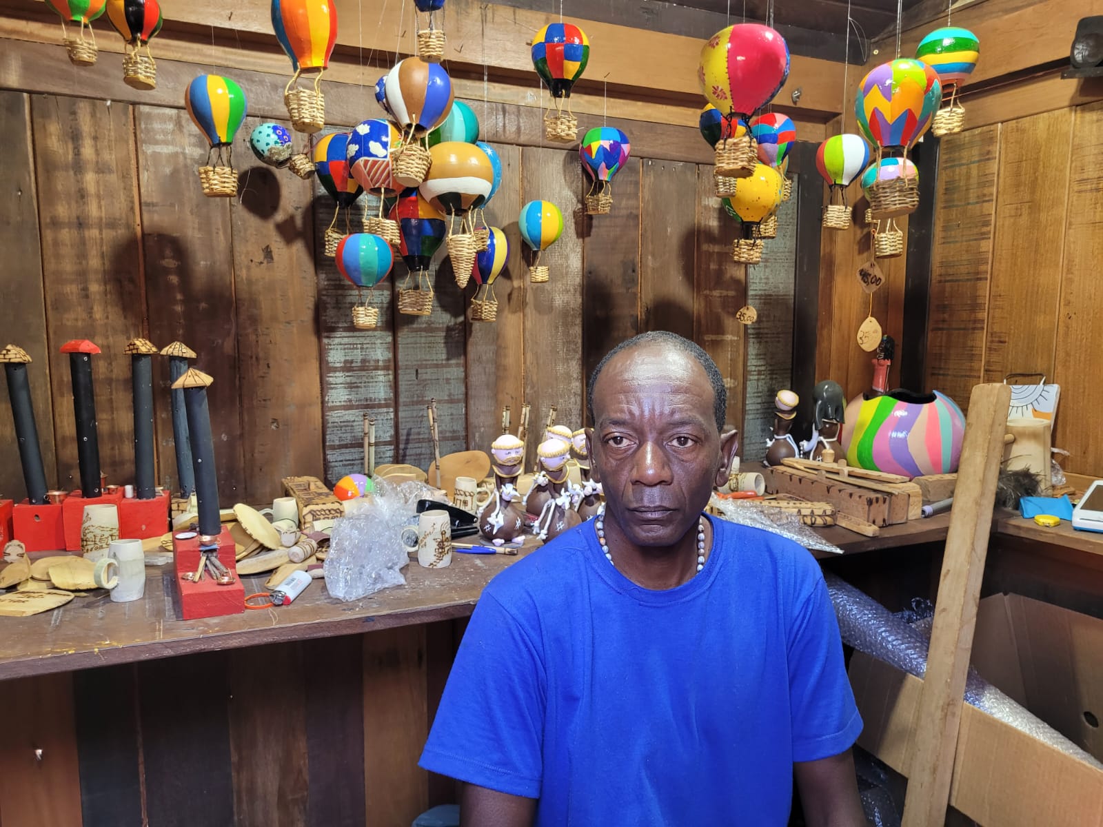 MESTRE PREGO – Claudinei Matias do Nascimento (1973) e sua esposa, a artesã Lucimar Cristina da Silva Nascimento (1979). O casal mantém atelier na Rua Alvarenga Peixoto, 1637, em Tiradentes – no caminho para o Bichinho. Eles chegaram aqui e passaram a trabalhar com as cabaças e com elas criam os balões coloridos, que podem ser uma “boa lembrança da cidade”, daí, surgiu, então, a “Barraca da Boa Lembrança”. Ele rememora sobre as cabaças, objeto utilizado pelos povos africanos sequestrados de seus territórios, trazidos para o Brasil e escravizados. Para a longa viagem de travessia oceânica, colocavam água nas cabaças. Durante séculos, as cabaças tiveram utilidades diversas no uso domésticos e sempre vinculadas ao povo afro-brasileiro.