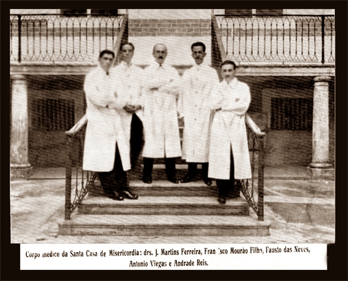 O último artigo, o 9º, estipulava que “o corpo clínico da Santa Casa não receberá nenhuma remuneração.” Depois de aprovado esse Regulamento, passou a fazer as nomeações de acordo com o Art. 3º. Foram nomeados os seguintes médicos: - Dr Antônio das Chagas Viegas para a 1ª seção; Dr. Fausto Carneiro das Neves para a 2ª e Dr. Francisco Mourão Filho para a 3ª, todos de Clínica Médica. Para a 4ª e 9ª seções Dr. Antônio de Andrade Reis e, finalmente, para a 5ª seção o Dr. Joaquim Martins Ferreira.
