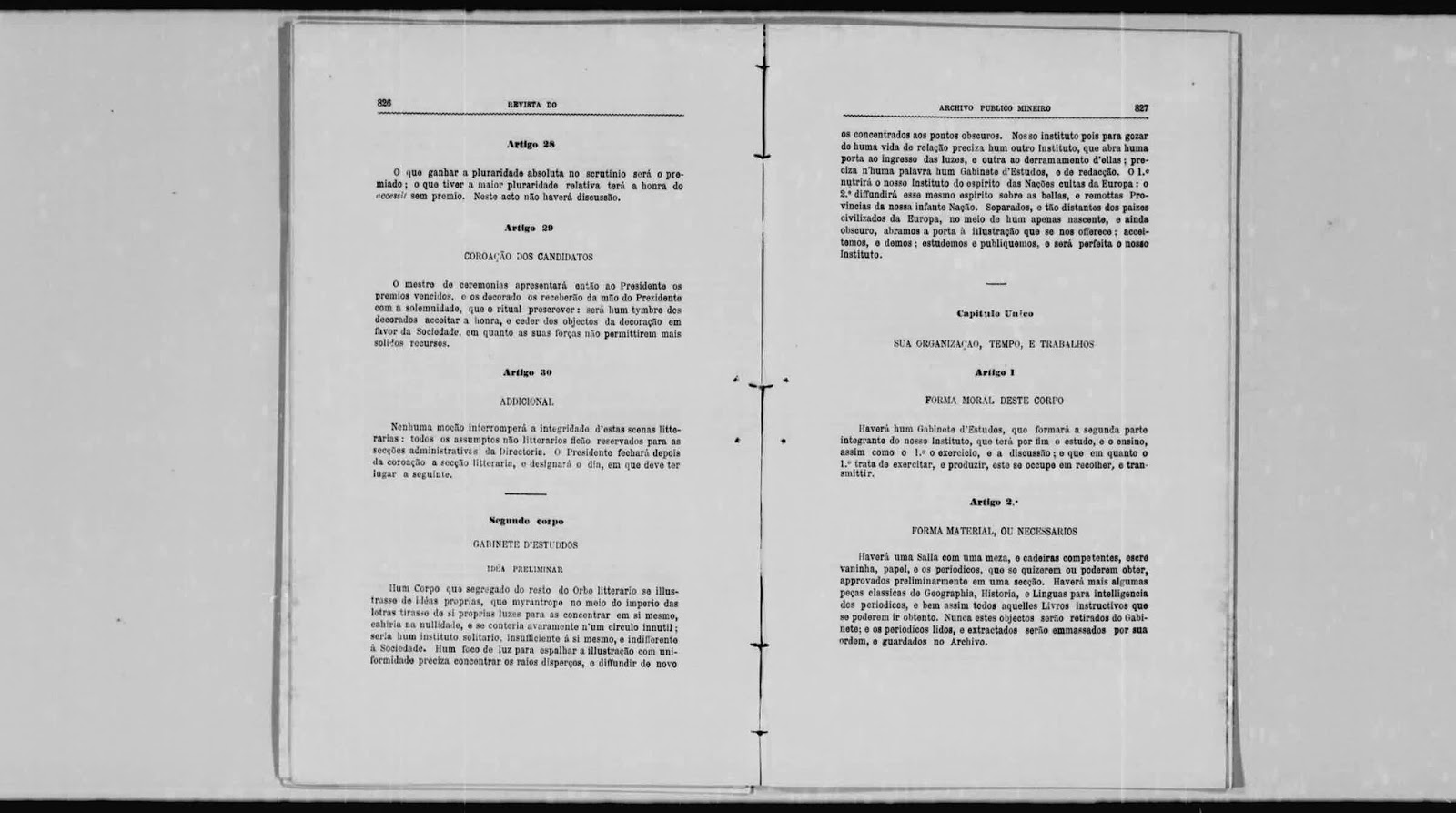 As Leis sociaes, e religiozas são a unica coacção externa, a pluralidade de suffragios da Assembléa a unica coacção interna, que marca os limites d'esta liberdade. Não será admittida de pessôa, ou corpo algum extrinseco, se não coadjuvante, e indirecta. Esta sociedade he igual, isto he todos os socios terão iguaes direitos, e deveres essencialmente, e só accidental, e temporariamente estes podem accumular-se por delegação spontanêa nos funcionarios, que serão ellegiveis, e amoviveis por seu turno: todos os Socios pois concorrem à celebração de seus actos, e sessõens e à administração de suas economias; e todos vice-versa tem o cargo respectivamente todos os onus e deveres da Sociedade. A sociedade consta de trez corpos, ou Institutos, e suas respectivas commissõens, e funcionarios — 1º Hum Instituto de Exercicio de Doutrina, e palavra com o fim de aperfeiçoar nossas faculdades pela deliberação, e pelo conflicto das Luzes em todos os assmptos dos conhecimentos humanos; o qual como theatro d'ensaios, e exercicios poderá intitular-se — Gymnasio Litterario — 2º Hum Instituto estudioso, a fim de nos enriquecer, e pôr ao nivel das luzes da Europa culta pela leitura das peças periodicas de varias Nações, e de repartir este thezouro com nossos Compatriotas por huma folha d'extractos por nós redegida: este corpo por intitular-se — Gabinete d'Estudos — 3º Hum Instituto economico, que pela ordem das coizas deve fazer sempre huma parte integrante de todas as Sociedades, que involvem e suppoem especies de administração, execução, economia, e policia: este Instituto, mais administrativo que litterario, e que encorpóra em si muitos elementos, que interpolados aos outros dous, cortarião a sua belleza, e integridade, pode intitular-se — Directoria —"
