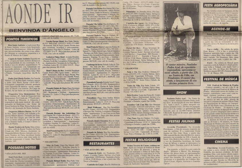 Na edição número 1 do jornal Gazeta de São João del Rei, veiculada dia 18 de julho de 1998, a equipe de jornalismo abordou as festas de Coronel Xavier Chaves, Tiradentes, Resende Costa, Carrancas e Entre Rios de Minas. Na semana passada, as exposições de Ritápolis e Coronel Xavier Chaves ocuparam a página 5 da Gazeta.