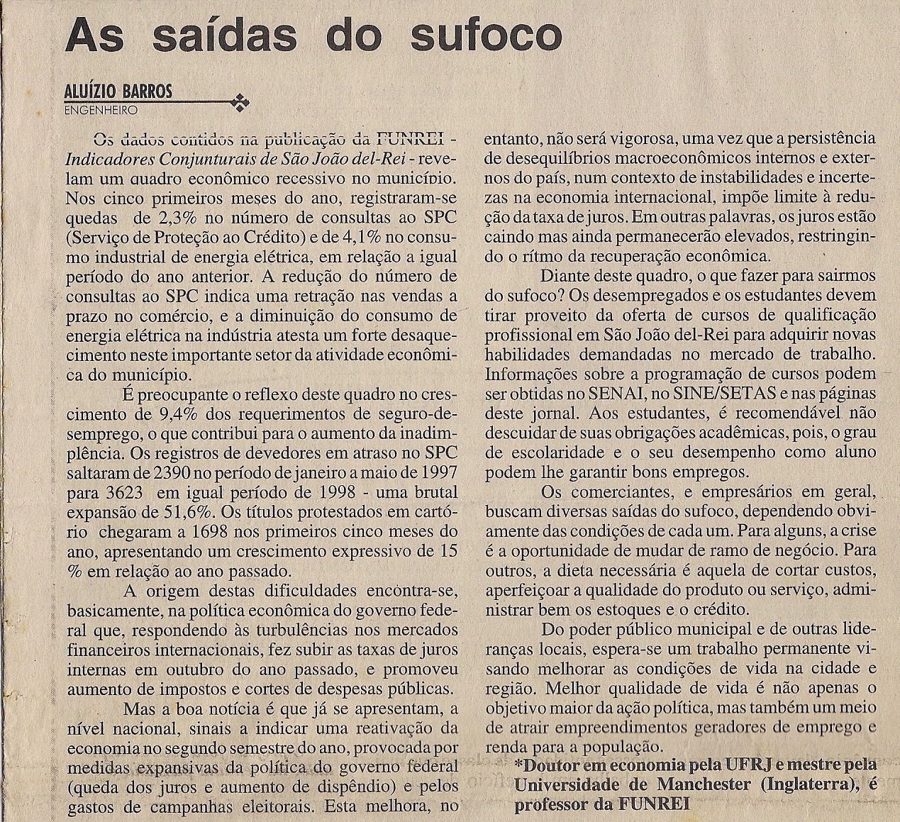Para apontar as oportunidades que a crise atual pode propiciar, a Gazeta de São João del-Rei convidou um economista da Funrei, professor Aluízio Barros, um empresário, Rafael Agostini e um geólogo, Áttila Godoy a manifestarem as suas opiniões.