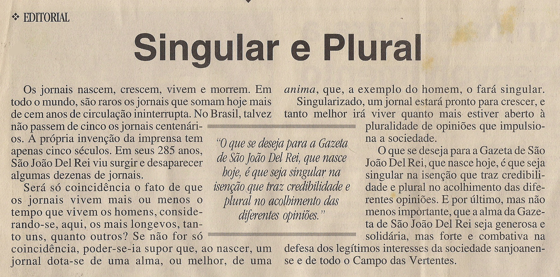 Singularizado, um jornal estará pronto para crescer, e tanto melhor irá viver quanto mais estiver aberto à pluralidade de opiniões que impulsiona a sociedade. O que se deseja para a Gazeta de São João del-Rei, que nasce hoje, é que seja singular na isenção que traz credibilidade e plural no acolhimento das diferentes opiniões. E por último, mas não menos importante, que a alma da Gazeta de São João del-Rei seja generosa e solidária, mais forte e combativa na defesa dos legítimos interesses da sociedade sanjoanense e de todo o Campo das Vertentes.