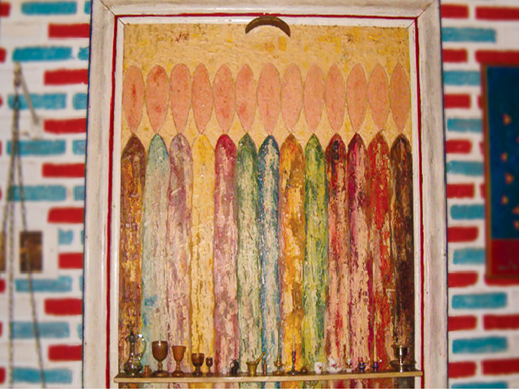 Despida de preconceitos, nua em pelo, desvairada de mineiridade, a arte de Marcos recebe o visitante com vitrais que reproduzem aqui e ali símbolos como o triângulo de Minas, oratórios sem santo, oratórios de tudo dentro, procissão de tipos populares e de santos.